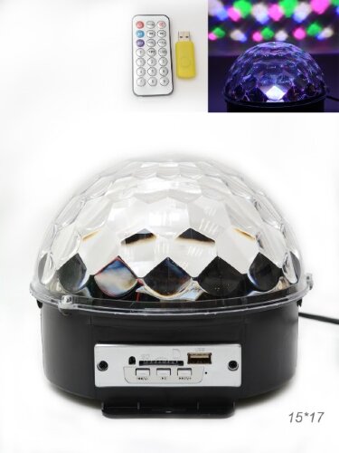 656849 (в уп.20шт.) - Светильник-проектор светомузыка Диско-шар, USB-порт, пульт. /М6/, размер: H=16см, D=17см, материал: пластик, металл.